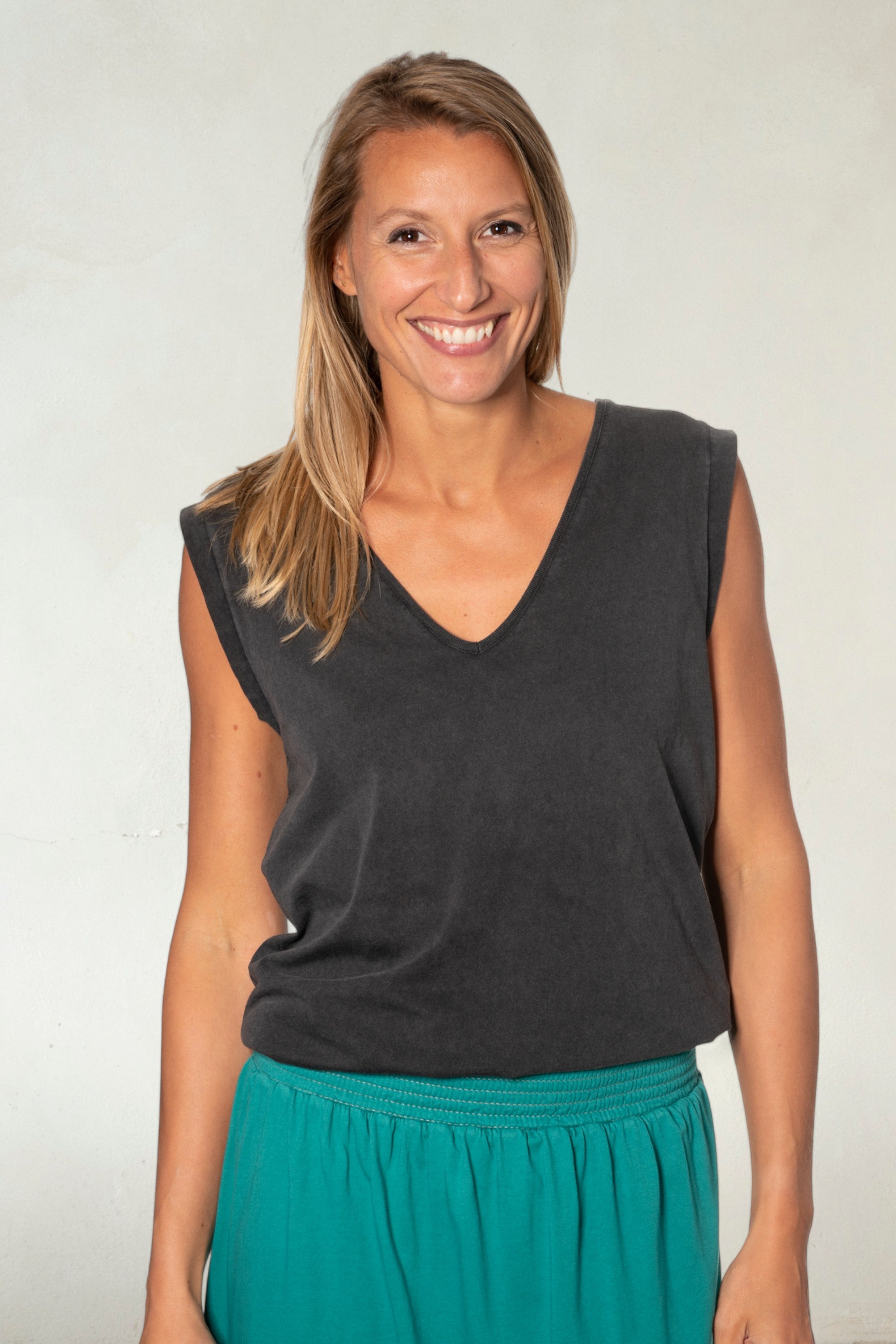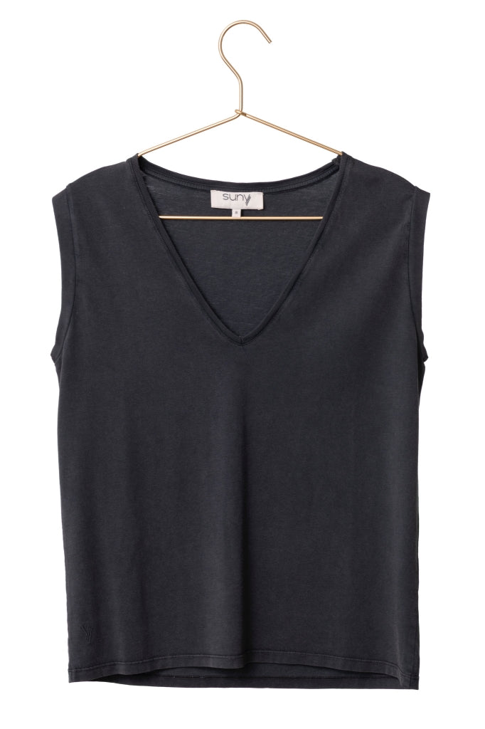 On vous a concocté une série en édition limitée de nos basiques fétiches en couleur "Noir vieilli", un ton à la fois vintage et rock! Et ce débardeur en fait partie.